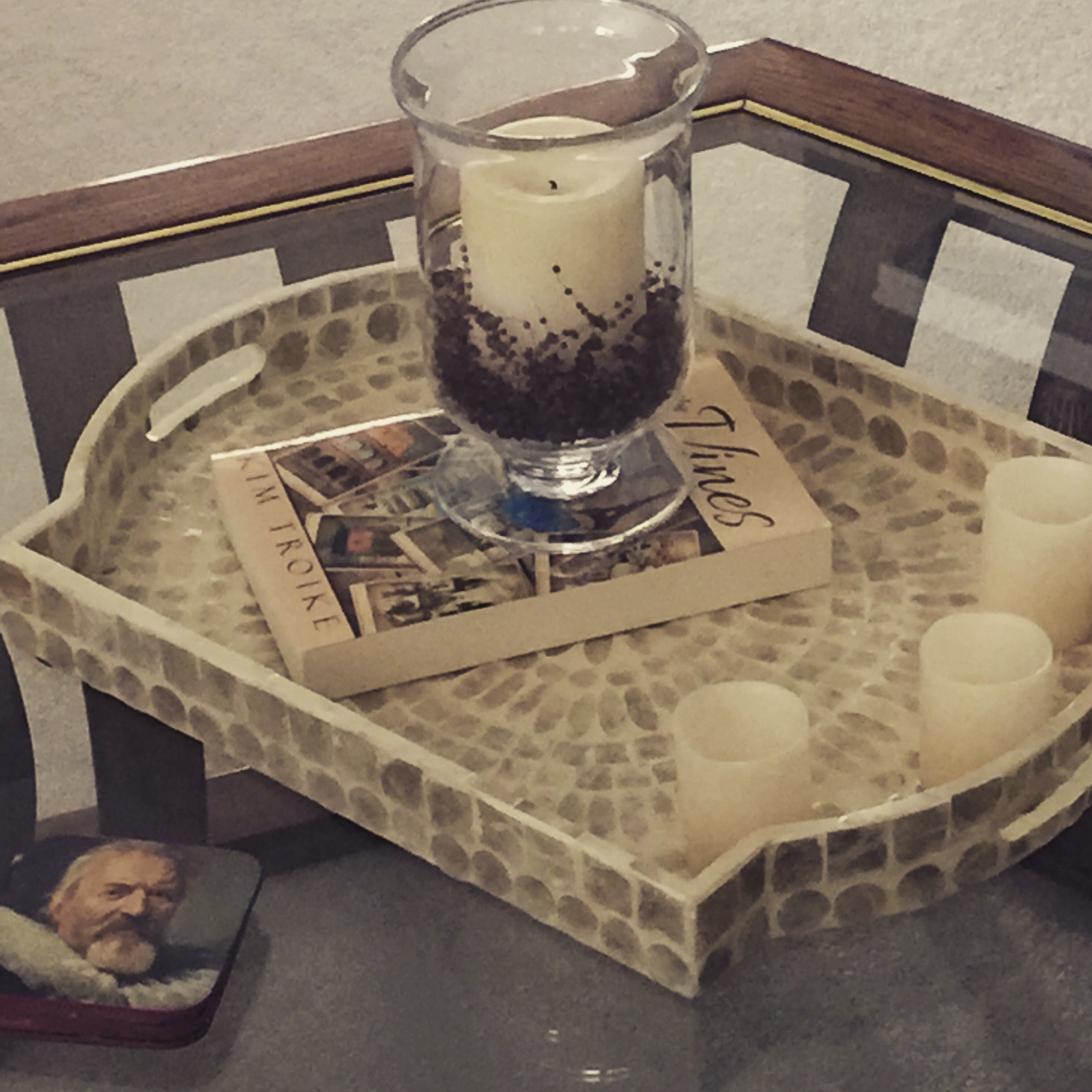 My mother has my book center stage! How surprised I was to find it on her coffee table, adorning the beautiful tray with candles. Sometimes in life what you do supersedes any words someone speaks.